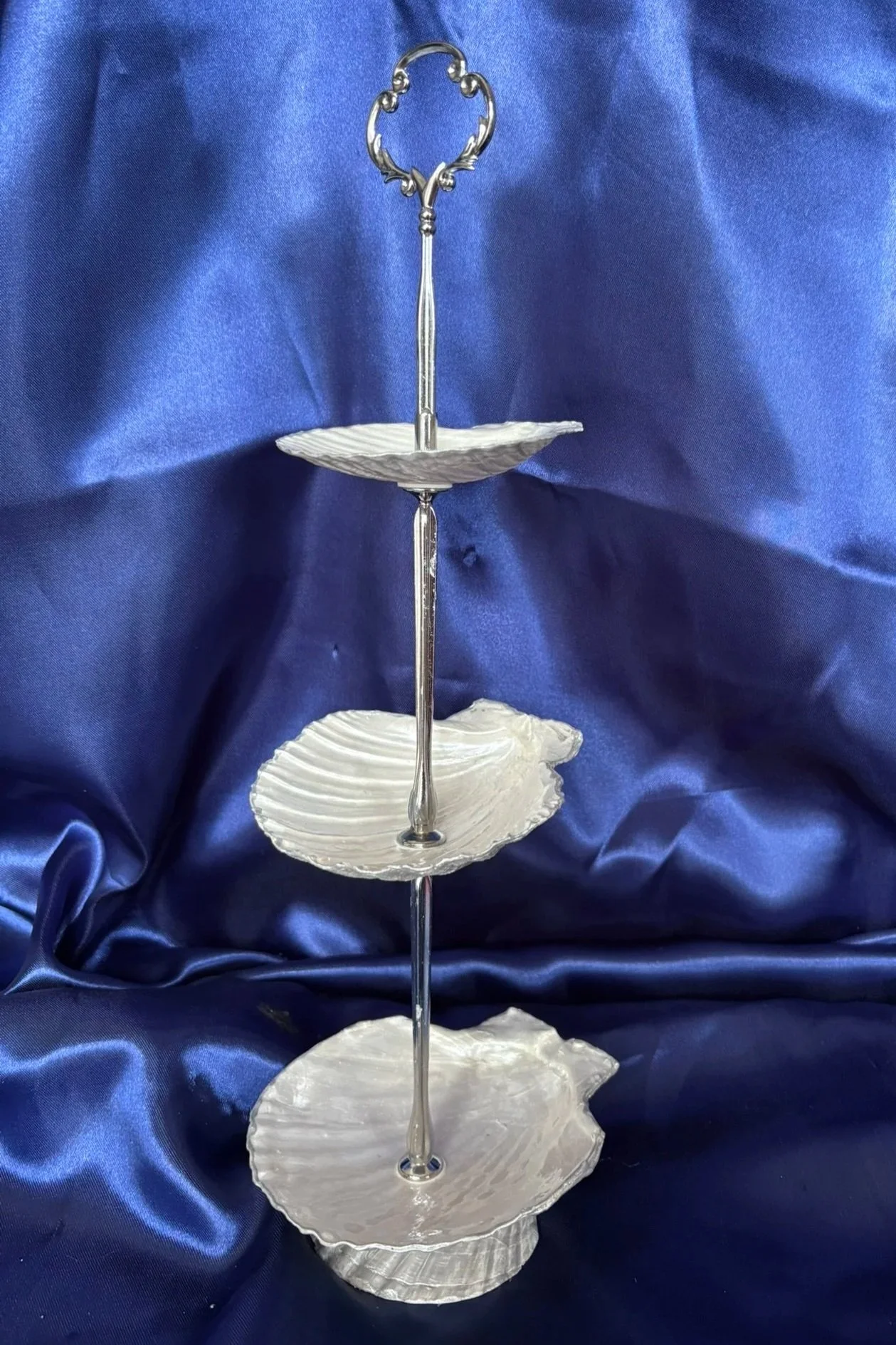 Crafted by a local artist along the Gulf Coast, this three-tiered scallop dish is a tribute to coastal elegance and sustainable luxury. Each natural shell is hand-selected and painted with a lustrous pearl finish, evoking the shimmer of ocean light. The edges are delicately trimmed in your choice of 24k gold or sterling silver paint, offering a refined touch that speaks to timeless sophistication.